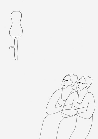 "Models and their significance for the artist's own biography, their influence on her work, the processes of appropriation and role play, and the way in which the artist approaches her own work are also the theme of a series of drawings in Indian ink created in a loose sequence since 1994: precisely structured sheets featuring highly abstract and reduced figures executed with a virtuoso economy of line. The motifs are partly inspired by mythological themes from Antiquity or allegorical representations from early art history (Pegasus, Medusa, Justitia); partly they refer to topoi of artistic self-representation. For instance we recognise charismatic figures of identification from the more recent past by their image-forming attributes (for what would Joseph Beuys be without his army vest?). ..."