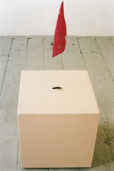A cube flesh-coloured, with smoothed edges: in the center of its upper side the slightly curved plastic top of a hair dryer peeks out. A red handkerchief made of cloth dangles from the ceiling on a transparent nylon thread above the hair dryer jet. The title of the object is written, white on red, in the upper area of the handkerchief: further down is a bright green stain of acrylic paint. If a visitor walks past, the hair dryer is turned on and makes the handkerchief swirl. Due to the motion, the inscription can hardly be read.